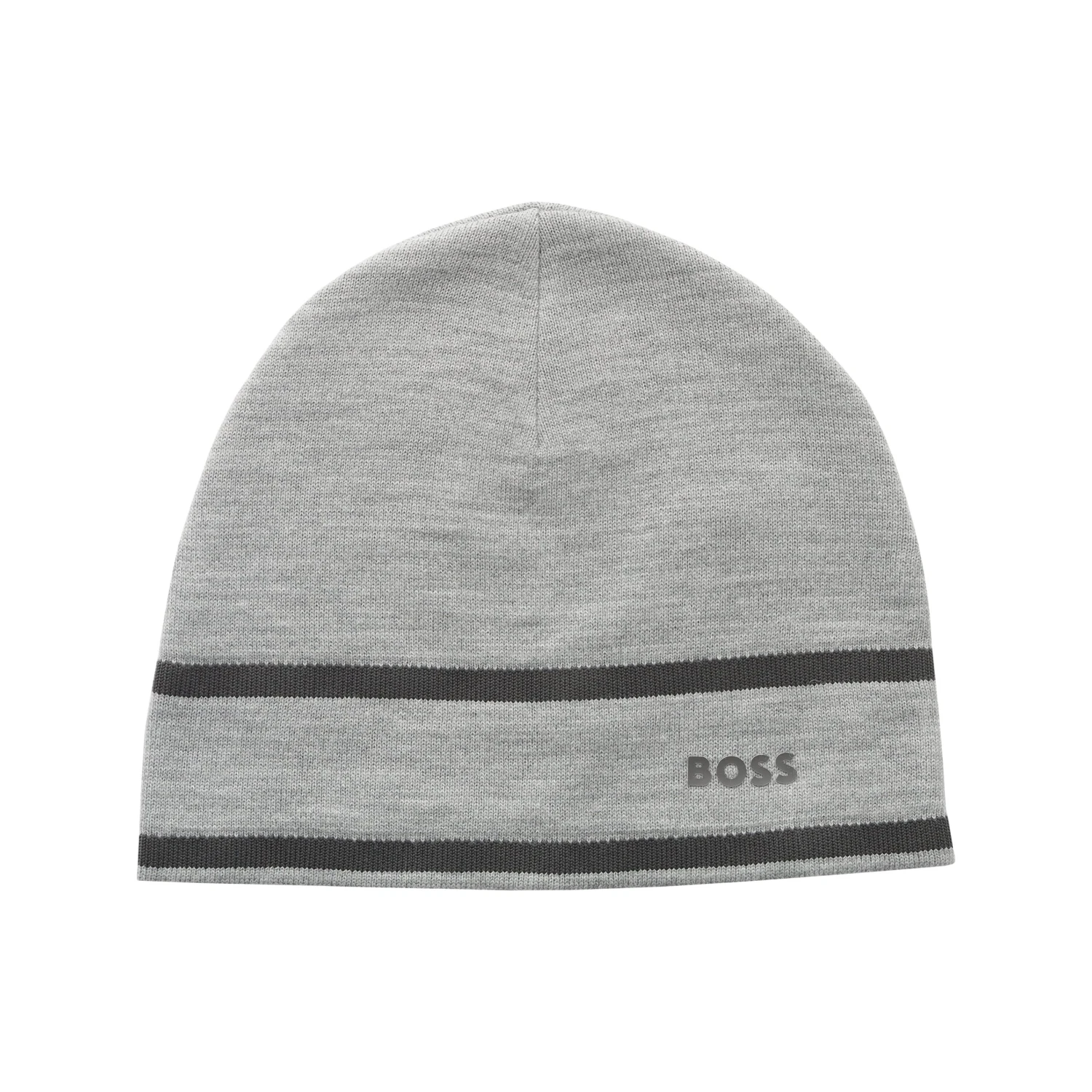 Mens Hugo BOSS Aline Beanie Hat. A fashionable beanie hat constructed in a wool blend fabric for a warm and cosy feel. Features a jacquard knit stripe design and is finished with BOSS Hugo Boss branding.