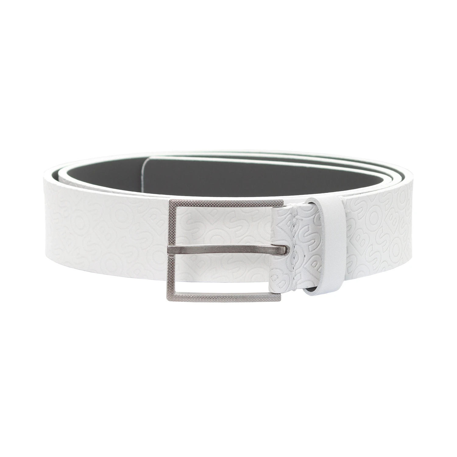 Mens BOSS Tril-BOSS-All Golf Belt. New for Fall/Winter 2022, A distinctive belt by BOSS, crafted in Italy. Featuring a raised all over BOSS branding for statement style, this 3.5cm belt is cut in structured Italian leather with a vegetable-tanned finish. A polished silver-tone pin buckle completes this modern accessory.