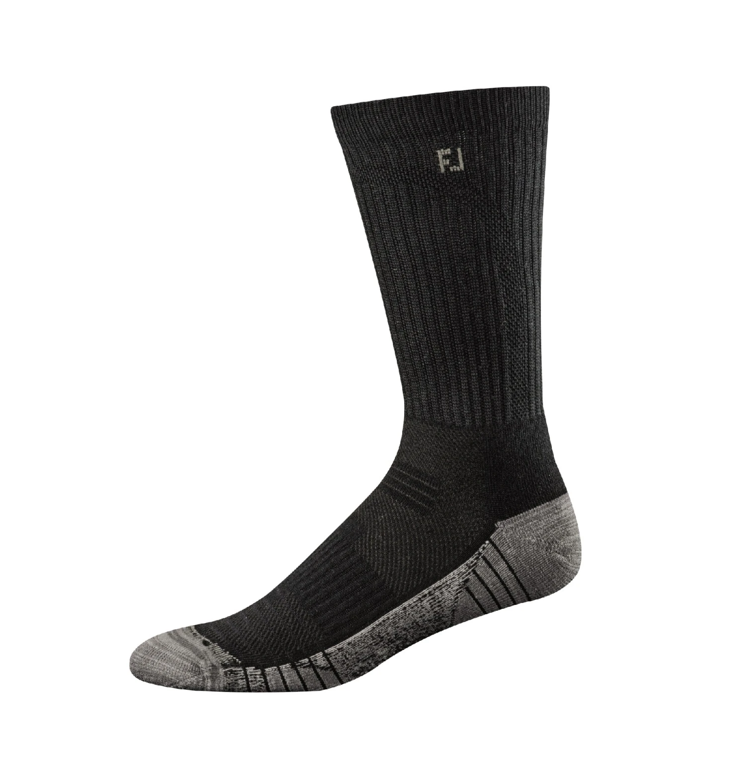 Mens FootJoy TechSof Tour Crew Golf Socks. A sock loaded with features and benefits to keep you comfortable throughout your round; DrySof moisture Control Technology throughout the sock moves moisture away from the skin, so that you don’t feel damp or cold. The Comfort Seam Toe Enclosure gives a smooth non-abrasive fit, with a double-layer,m reinforced heel for comfort and durability. Anatomically correct foot beds combined with targeted cushioning in both the ball and heel of the foot provide enhanced cushioning. Complete Arch Support, finishes a sock that delivers the maximum, in comfort, cushioning, breathability and durability. 41% Acrylic, 38% Polyester, 16% Nylon, 5% Spandex