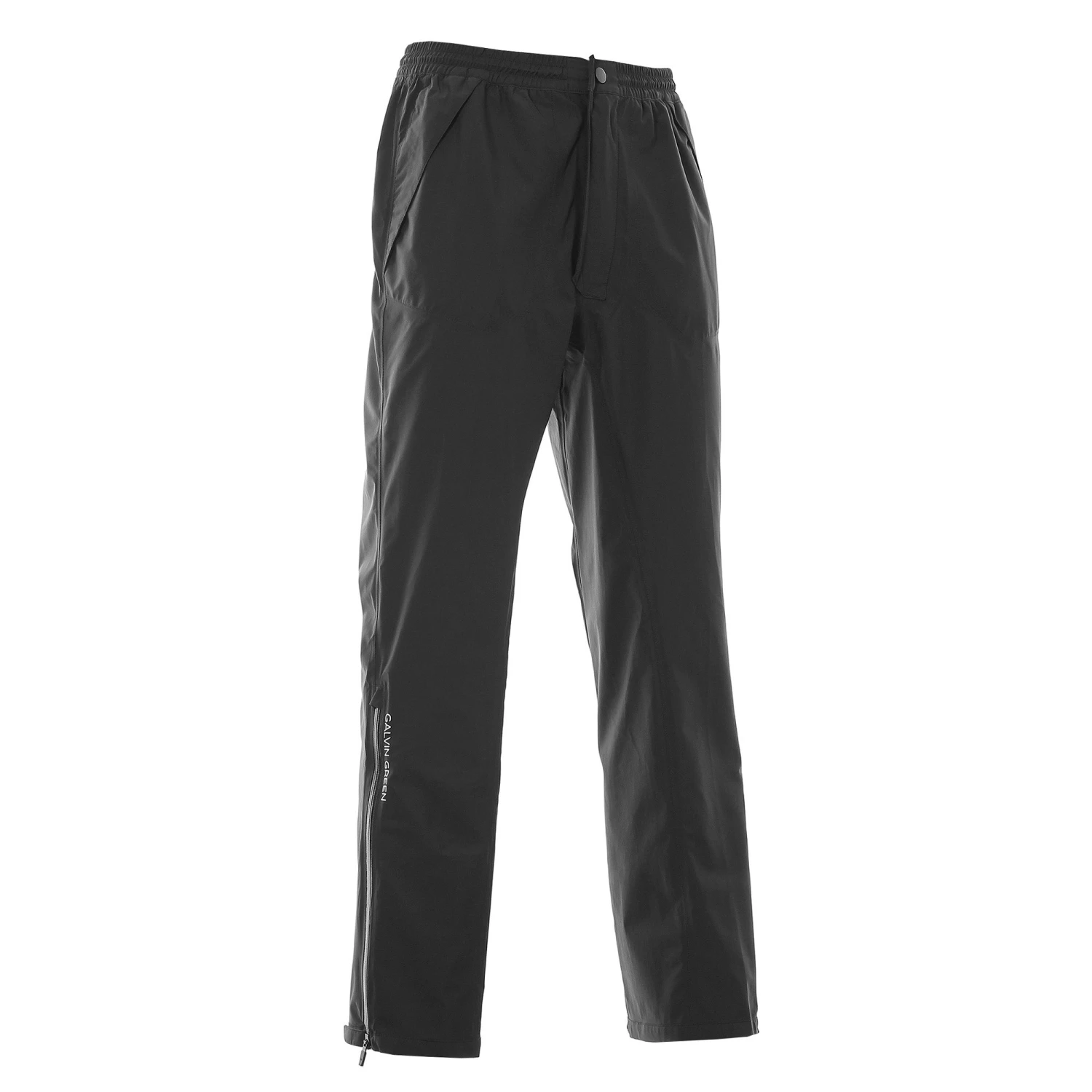 Mens Galvin Green Arthur Paclite Stretch Gore-Tex Waterproof Golf Trousers. A waterproof golf trouser constructed from GORE-TEX Paclite Stretch Technology fabric, an ultralight fabric allows maximum breathability by releasing excess heat and moisture, whilst keeping external elements at bay. Full stretch is used throughout the garment to maximize freedom of movement throughout the swing. Garment features include; adjustable drawcord & elasticated waistband, zippered lower legs and velcro adjuster, zippered fleece lined front pockets, rear pocket and split inseam for extra comfort and abrasion resistance. Galvin Green logoing lower right leg and left pocket. Extremely hard wearing and long lasting, easy to wash and maintain; machine washable. 100% Polyester – GORE-TEX Stretch Paclite fabric – Lifetime waterproof warranty