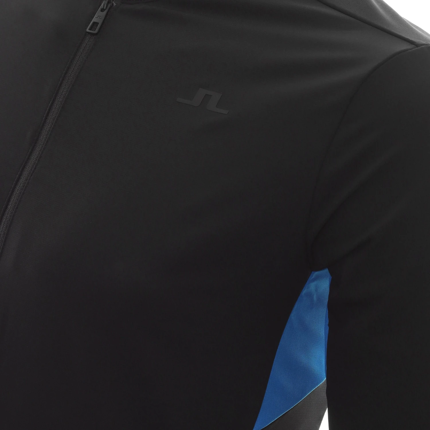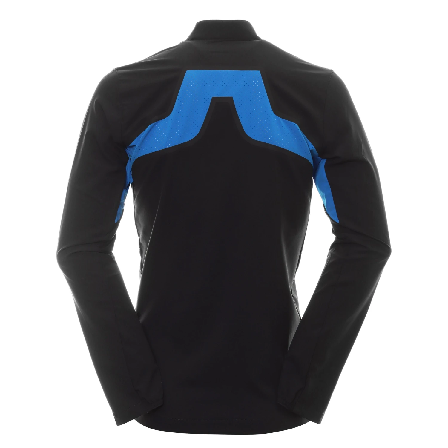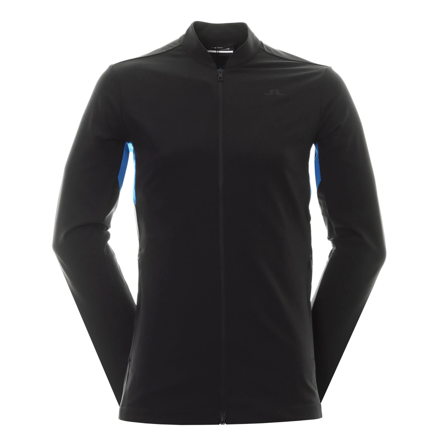 Mens J.Lindeberg Golf KV Hybrid Jacket. Updated for Spring Summer 2022, a hybrid, outerwear jacket constructed in a lightweight, water and wind resistant, stretch fabric with cooling laser-cut perforations at the back.