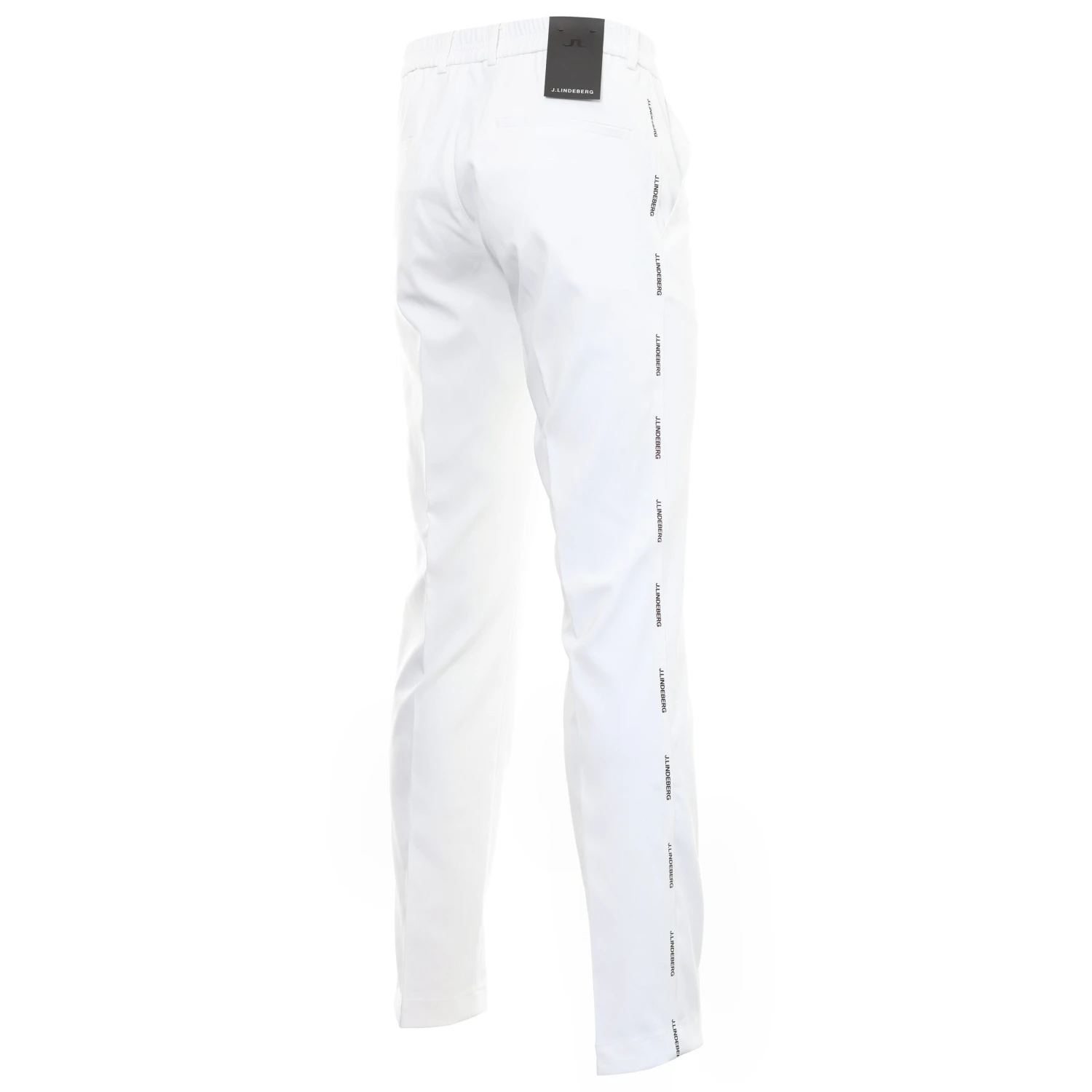 Mens J.Lindeberg Golf Stuart Stripe Pant. New for Spring Summer 2022, a lightweight trouser constructed in a stretch fabric with a subtle twill structure. Features a tape side stripe with J.Lindeberg wordmark for a clean yet modern look.