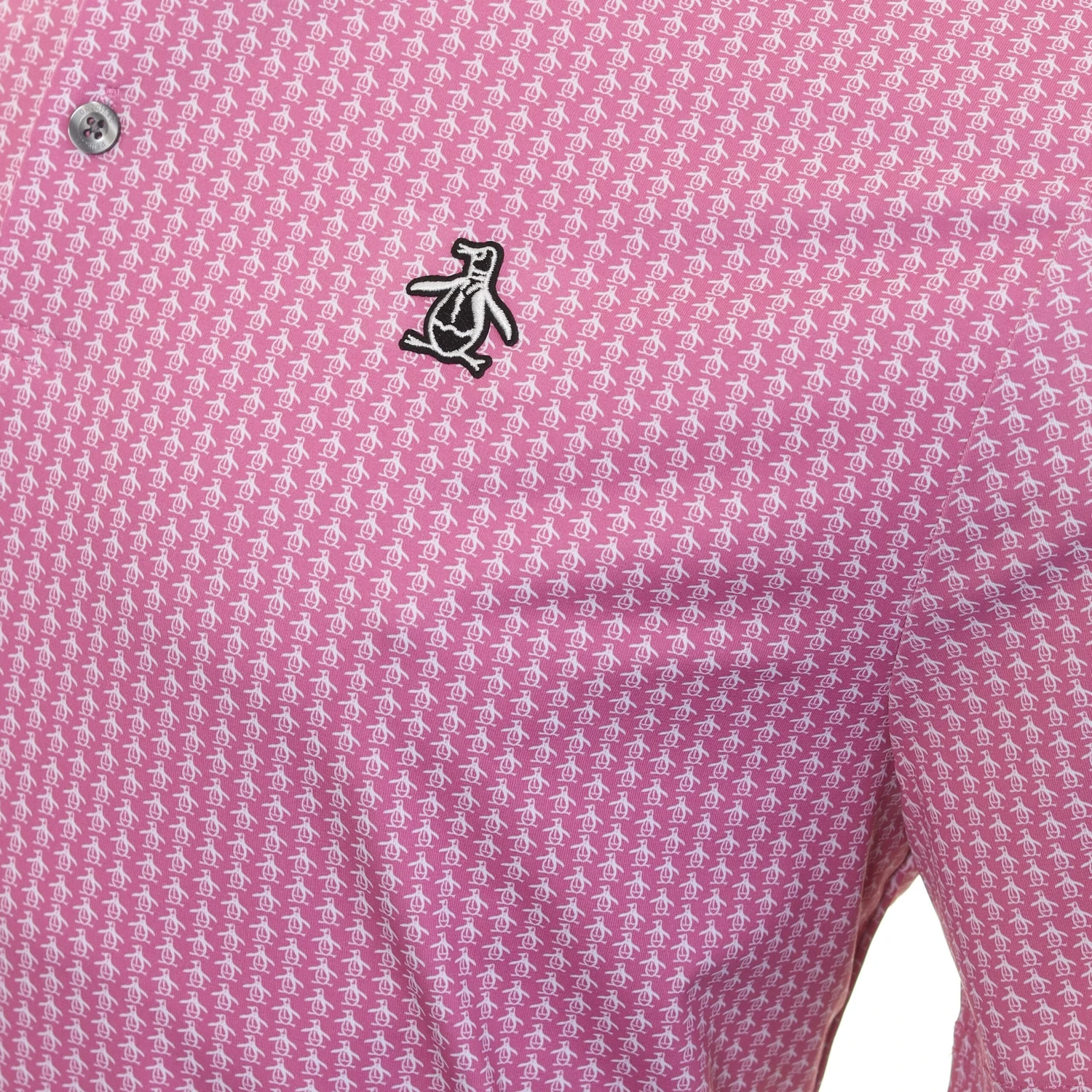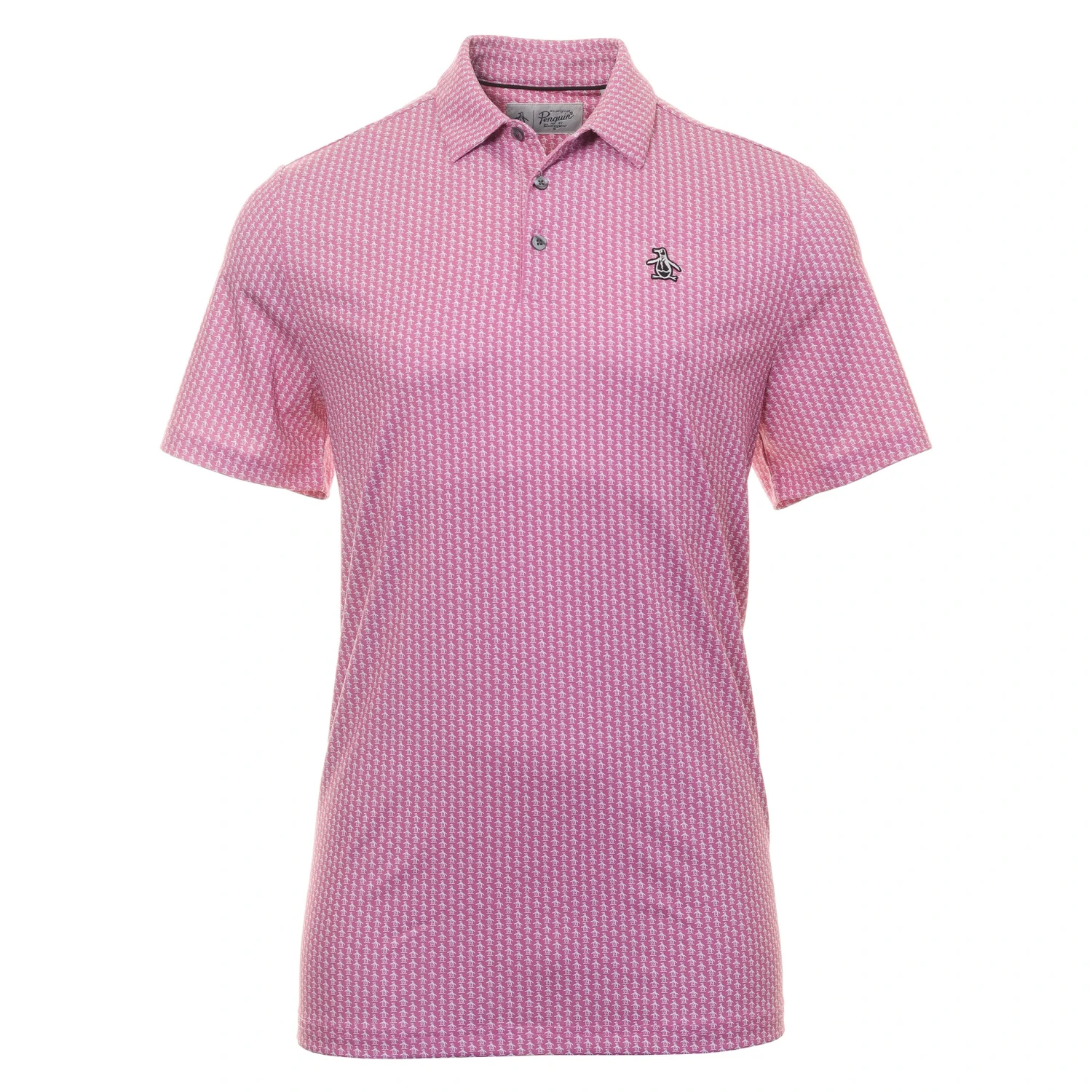 Mens Original Penguin Golf Allover Pete Printed Polo Shirt. A 2-button placket polo shirt constructed from a moisture wicking fabric; OPG moisture management system, will keep you fresh and dry throughout your round. Stretch construction fabric adds comfort for a friction free swing.
