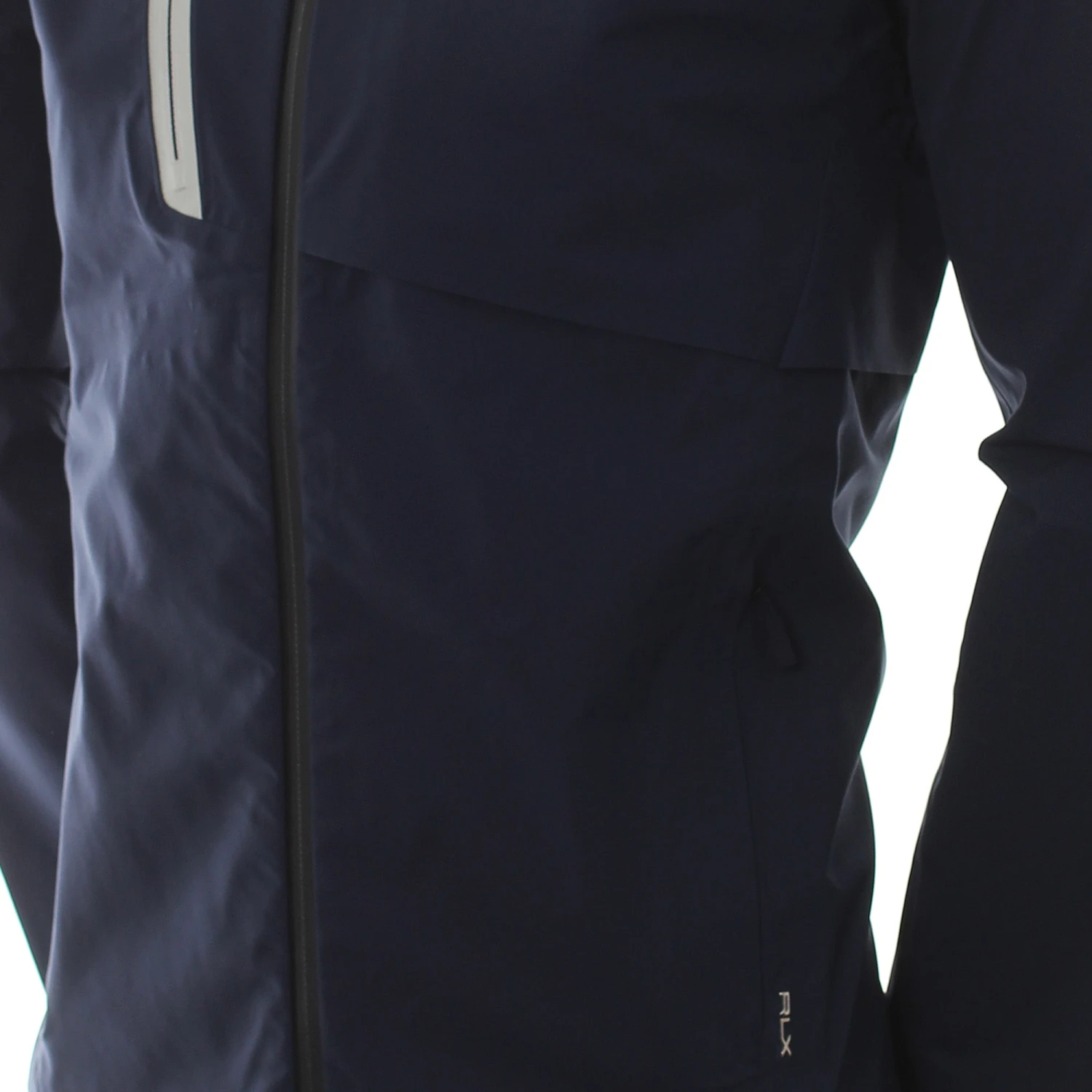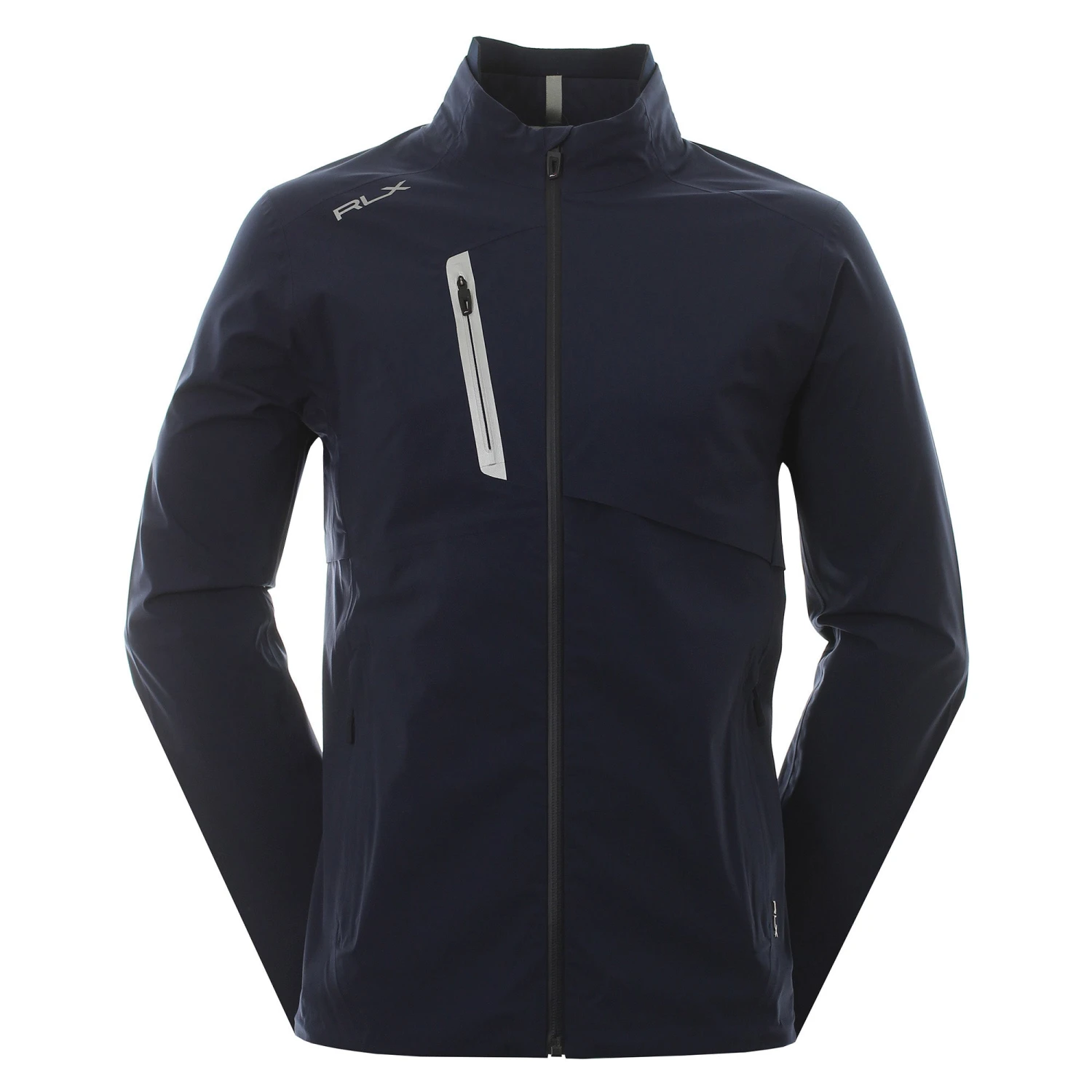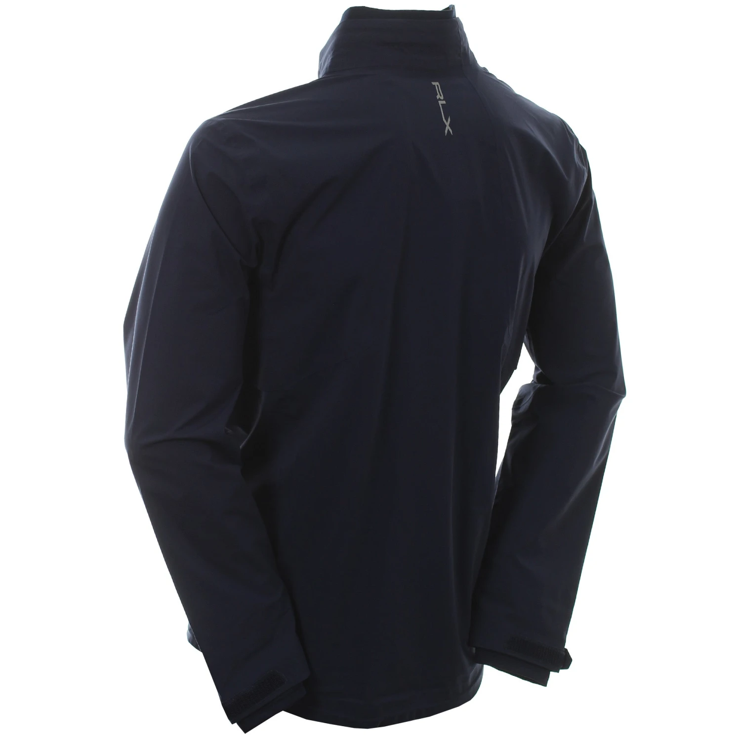 Mens RLX Ralph Lauren Iron Full Zip Waterproof Jacket. A full zip, fully seam sealed, waterproof jacket. Constructed from a highly breathable, stretch, fabric, this garment offers chest and underarm vents for added breathability. Other features include; partially fleece lined mock neck collar, inner storm flap to zip placket, velcro adjuster cuffs, inner compression cuffs, drawcord adjuster at waist and drop tail hem for enhanced coverage.