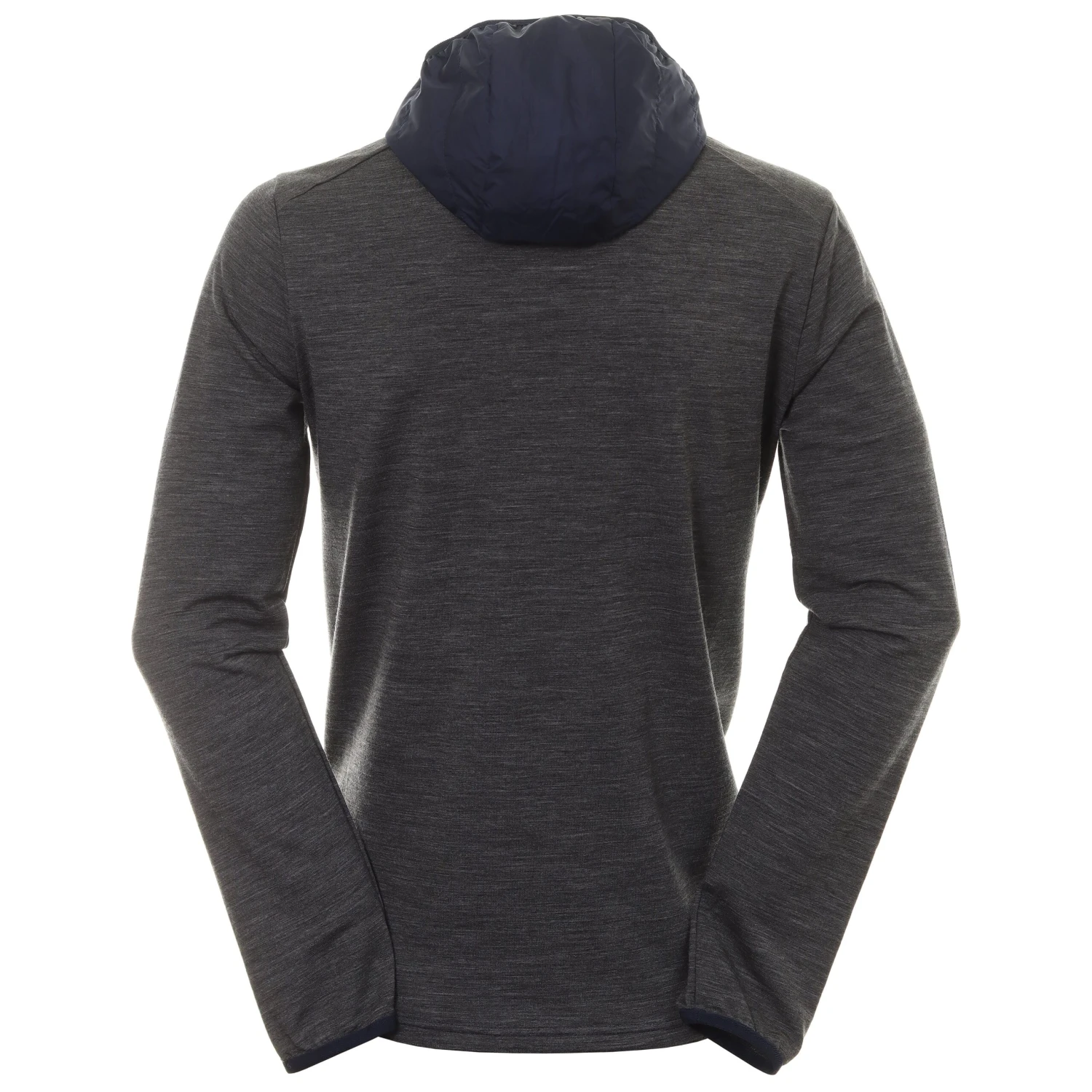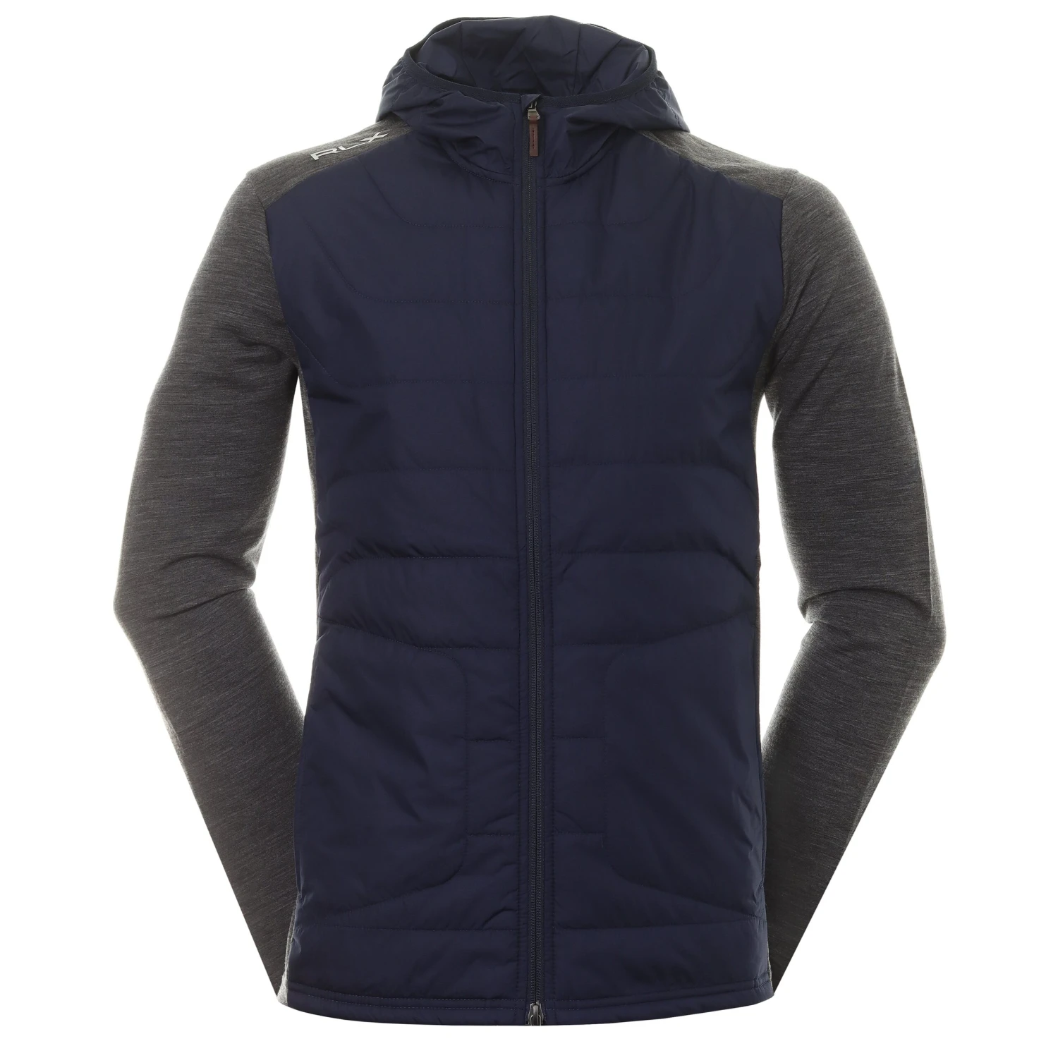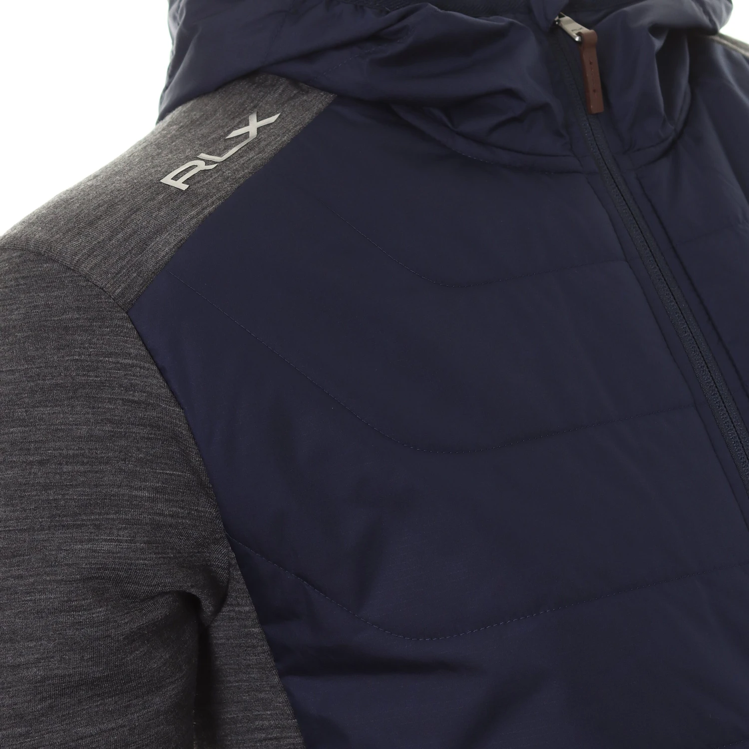 Mens RLX Ralph Lauren Panelled Stretch Terry Jacket. This golf jacket fuses stretch terry with an insulating front panel, ensuring lightweight warmth and effortless movement with each swing. It is also made with recycled polyester, which helps lessen environmental impact by reducing landfill waste and the use of virgin raw materials.